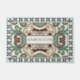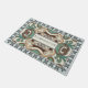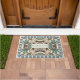 An elegant doormat featuring your nameplate overlay on a beautiful pattern of flourished geometric shapes in greens, cream, tan, blue. An eye catching character filled flowery entryway doormat reminiscent of ancient mosaic tiles.