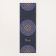 Elegant gradient mandala on navy blue yoga mat with personalized light grey text at the front and back of the yoga mat. You can add your name or leave it blank.