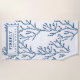 NewParkLane - Elegant Coral Reef Themed personalized beach towel, featuring an elegant pattern of steel / indigo blue seaweeds against a white background. The front has a blue trimmed text frame for your personal texts, that are easy to adjust for a personalized design. A sophisticated design for for your vacation rental, lake or beach house or beach cottage.