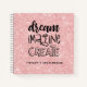 This personalized girly 8.5 x 11 sketchbook has black text on a pink faux glitter background. The words, "DREAM,IMAGINE,CREATE" in a hand drawn font personalized with your name below. Customize the sketchbook with the name of your choice to make someone feel extra special. Makes a fun gift for birthdays or for Christmas. Comes in a variety of colours. Designed for you by Blackberry Boulevard.
