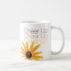 The artwork features a macro photograph of the bright sun yellow petals of a black-eyed Susan flower, which is said to provoke happiness, optimism, and positivity. The flower is presented with elegant typography repeats that read "Cheer Up!" in yellow and wine brown colours. Personalize this cheer up mug or purchase as is.