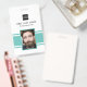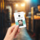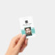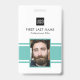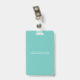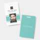Personalized business office ID badge featuring a teal and white background, a photo of the employee, your company logo, name and profession.
