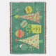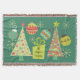 Pretty personalized Everything Christmas throw blanket with a background of teal with cream snowflakes, two decorated Christmas trees with stars on top, four pretty holiday ball ornaments, and a green package with ribbon and an area you can customize with your family name!