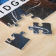 Custom jigsaw puzzle personalized with your photo and family surname. Your custom name is written in an uppercase black font with a white background, and the word "family" is written in an elegant hand lettered font script with curly swashes. Click "Personalize" to add your family name monogram and a large photo of your family. Click "Click to customize further" to change the font and text color. A custom jigsaw puzzle makes a great gift for family and friends!