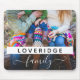 Custom mouse pad personalized with your photo and family surname. Your custom name is written in an uppercase black font with a white background, and the word "family" is written in an elegant hand lettered font script with curly swashes. Click "Personalize" to add your family name monogram and a large photo of your family. Click "Click to customize further" to change the font and text colour. A custom mouse pad makes a great gift for family and friends!