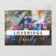 Custom postcard personalized with your photo and family surname. Your custom name is written in an uppercase black font with a white background, and the word "family" is written in an elegant hand lettered font script with curly swashes. Click "Personalize" to add your family name monogram and a large photo of your family. Click "Click to customize further" to change the font and text colour. A custom postcard makes a great gift for family and friends!