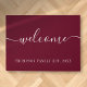 Elegant personalized family name doormat featuring your family name with your established date set in a classic white text on a burgundy background with the message "welcome" that is set in an elegant white script text. Personalize with your details and customize the colour to the colour of your choice. Designed by Thisisnotme©