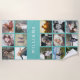 Display fifteen favourite photos or vacation memories on this uniquely printed personalized beach towel, featuring a gridded layout and square photos on a tropical turquoise background. Perfect for your Instagram snaps, towel features 15 photo templates with your family name or choice of personalization in modern script lettering.