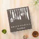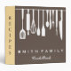This is beautiful personalized recipe book full of favourite dishes, organized into one beautiful binder. Personalized with your text on the front, and featuring an original illustration of a white fork, knife, and spoon surrounded by a curly swirly border on a burlap looking background. Kitchen tools Recipe binder would be perfect for anything. You can easily change text colour, font, size and position by clicking the customize button.