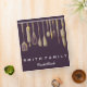 This is beautiful personalized recipe book full of favourite dishes, organized into one beautiful binder. Personalized with your text on the front, and featuring an original illustration of a white fork, knife, and spoon surrounded by a curly swirly border on a burlap looking background. Kitchen tools Recipe binder would be perfect for anything. You can easily change text colour, font, size and position by clicking the customize button.