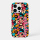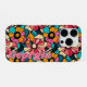 Retro-style floral pattern with bold colour flowers in pinks, oranges and turquoise is a fun background for your phone case. Personalize with your name in pink with a bold, retro 70's style typeface.