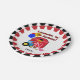 Personalized Farm 5th Birthday paper plates, cute and colourful, great for the farm or farm animal theme birthday celebration! These farm theme fifth birthday paper plates feature outside decorative rings of black, yellow,and red with a red hay barn, pig, chicken, blue farm tractor, birthday balloons, text that reads Celebrating My 5th Birthday, and an area you can add the birthday child's name!