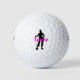 Personalized female golfer golf balls. Black silhouette of a female golfer with a golf club by her side and personalized with your name across the front in pink. You can customize further by changing the font and colour in the design tool edit section when personalizing.