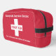 Personalized First Aid Kit tote bag. Daycare, school or family first aid kit perfect to hold medicine, inhalers, epinephrine and first aid items. Customize with the name of the facility or your first or last name. Edit to list the bag's contents or clear the text if you do not wish to personalize it. Large white first aid symbol on a red background. Designs by Lil Allergy Advocates www.lilallergyadvocates.com