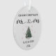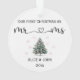 Round, white Christmas ornament decorated with elegant black script that reads "OUR FIRST CHRISTMAS AS Mr ♥ Ms." Below the text, there is a charming illustration of a Christmas tree adorned with soft pink ornaments, surrounded by small pink snowflakes. The bottom of the ornament features the customizable names and the year placeholder The. overall design is festive and romantic, creating a personalized keepsake for couples celebrating their first Christmas together as Mr. and Ms.