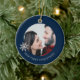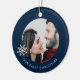 Celebrate a special milestone with this Personalized First Christmas ornament. Cherish your first holiday together as a couple with this exquisite ornament featuring a customizable photo framed by a delicate snowflake on a rich navy blue background. The front elegantly displays 'Our First Christmas' in the lower thirds, capturing the magic of the moment. Turn it around to find the snowflake-adorned back, ready to be personalized with your names and the memorable year. This unique ornament is a perfect addition to your tree and a wonderful keepsake to mark your journey together.