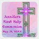 Pretty pink colours "Name's First Holy Communion" with the date stickers original art design with a special cross with star burst all reflected in the peaceful water ripples below. Easily change the name and date. Remember this special holy day with these custom stickers for the special day for your family and friends and any guests. Can also be used for a baptism or confirmation easily when the text is customized and changed. A wonderful party favour and envelope seal.