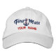 A dynamic personalized First Mate cap in nautical red, white, and blue style embroidered hat sure to make an impression on, or off the boat. Make this rope anchor design embroidery as unique as you are with your name, your location, or your boat's name.