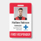 Personalize these vertical medical personnel or first responder badges with an employee photo and name, along with multiple custom text fields for title or role, hospital or healthcare facility name, employee ID number, or valid through date, along with the company logo. "FIRST RESPONDER" or your desired text appears along the bottom in bold white lettering for easy identification. Customize with a barcode on the back if needed, along with return information or other details.