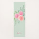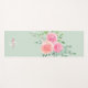 This pretty yoga mat is decorated with a watercolor bouquet of roses and foliage in shades of pink and coral on a soft green background.