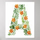 Floral Letter A in orange flowers and green watercolor leaves. Personalized floral monogram. Botanical illustration. Cute and brith design. Lovely and stylish personalized item.