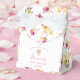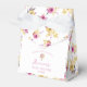 Personalized Floral Pattern Hot Air Balloon Favour Boxes. An all-over watercolor floral print in pink and gold. FRONT: A small hot air balloon. Personalize the template with your message, name, event title, and date. © Kimbellished, LLC