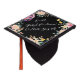 An elegant graduation cap topper featuring a black background with florals and custom quotes