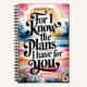 A serene and spiritual illustration of the text "For I Know the Plans I Have for You" in elegant, bold calligraphy. The phrase is beautifully encircled by watercolor fields of pink, orange, and blue, blending harmoniously. A soft sunrise illuminates the background, casting a peaceful glow over the scene.personalized with name.
