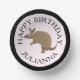 This happy armadillo is looking for birthday fun! Drawn in cute cartoon illustration style with black and pink.