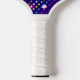 You'll be all the rage on the pickleball court when you're sporting one of these brightly coloured personalized circles with diagonal dashes pickleball paddle with monogram. The navy blue background has a diagonal stripes pattern of dashes in purple, yellow, blue, and white with a variety of circle shapes mixed in among the dashed lines in neon green, yellow, hot pink, orange, burgundy, and white with an orange and burgundy band across the top with a white and light blue circle overlay that is personalized with your name in hot pink and your monogram in yellow. The backside has only the band on it with customizable text that says, "Pickleball Addict" on it. Email niteowlstudio@gmail.com with any request for changes.