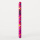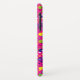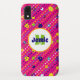 This hot pink cell case cover has colourful patterns of random circles that are overlaid by diagonal dashed lines in bright yellow, orange, purple, green, burgundy, navy, light blue, and white. Customize the white and orange circle with your name, initials, monogram, or other wording. Make the circle and name as big or little as you like, or remove it completely.