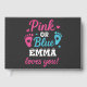 Celebrate your special moment with this personalized gender reveal design! Featuring playful pink and blue baby footprints with the phrase 'Pink or Blue, [Name] loves you!', this cute design is perfect for baby showers, pregnancy announcements, invitations, apparel, and gifts.