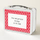 This is a standard metal lunchbox that appears to work just fine. We designed this box ourselves with an uploaded photo and custom text on the front and back. It looks absolutely beautiful except the front of the lunchbox is not centered like it shows in the photo. The print borders don't align with the inset flat part of the box where the preview photo online showed it perfectly centered in there. The back looks nice and centered though.
