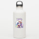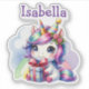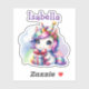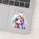 Cute little girl's name personalized party sticker with an adorable cartoon rainbow unicorn with a birthday hat on holding a gift with a rainbow in the background.