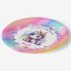 Cute personalized little girl's birthday party paper plates with an adorable cartoon rainbow unicorn with a birthday hat on holding a gift with a rainbow in the background.