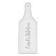 Personalized glass cutting board with handle. Add your own custom name or quote. Elegant gift idea for chef, cook, mom, wife, dad, father, etc. Handy cooking supplies for kitchen or restaurant. Paddle shape with script typography. Special Birthday or Christmas gift ideas.
