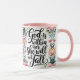 God is Within Her : Psalm 46:5 Christian mug . A watercolor floral border in soft pinks and purples surrounds elegant gold script that reads “God Is Within Her, She Will Not Fall". personalized with name.