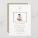 Celebrate your child's First Holy Communion with this elegant and customizable invitation. The design features a gold-accented cross at the top, symbolizing faith, and a central framed photo of your little one, making the card truly personal. The white background and refined gold text lend a clean and sophisticated look, while the blend of script and serif fonts adds a classic touch. Perfect for creating a cherished memory of this special occasion.