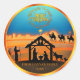 Add a touch of sacred beauty to your holiday gifts and greetings with this exquisite Nativity scene Christmas sticker, a unique design by you! This round sticker features a serene silhouette Nativity depicting Mary, Joseph, and baby Jesus in the manger, accompanied by a shepherd, donkey, and sheep. In the background, the Three Wise Men journey towards the Star of Bethlehem under a captivating blue and golden gradient sky, with a subtle cityscape silhouette on the horizon.