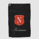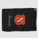 Personalized gold towel gift with classy logo. Custom golfing gift for men and women. Red shield emblem with name initial.