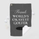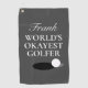 Funny custom golf towel for world's okayest golfer. Personalized present for him or her. Unique golfing gifts for men and women. Elegant script typography template for name or monogram letters. Fun Birthday gift ideas for golfer, husband, dad, father, friend, co worker, boss, colleague, coach, instructor, trainer, teacher, grandpa, retired person, golf lover, instructor etc. Add your own surname or funny quote. Including hook to hang it up on your trolley. Unique golf accessories for friends and family.