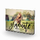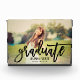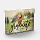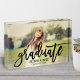 A striking graduation photo block featuring a full senior portrait with Graduate in bold black brushed script across the design and the graduate's name and class year in clean serif type. The high-contrast script creates a modern, statement keepsake. Customize with a favourite portrait and details for a personalized graduation gift or desk display.