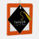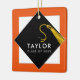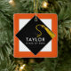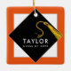 Graduation memento gift and Christmas ornament featuring classic black graduation cap and gold tassel design on an orange background. To personalize edit text to add graduate's name and the senior class year.
