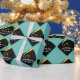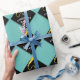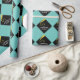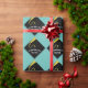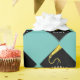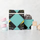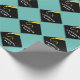 Creative graduation gift wrap or party decor featuring black and gold grad cap on teal blue background. To personalize edit text to add name or otherwise customize.