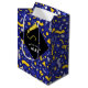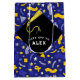 Creative graduation gift bag or party favour bags featuring classic grad cap design, congrats and blue and gold confetti. To personalize edit text to add his or her name.