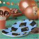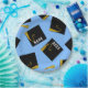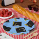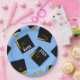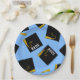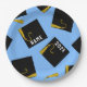 Creative graduation party plates featuring black and gold graduation caps on a light-blue background. Edit text to add grad's name and the senior class year.