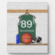 Personalized Green and white basketball jersey hanging in a locker room with a basketball , basketball sneakers and a drinks bottle. The jersey is customizable with your own numbers and name, to create a truly unique gift for the Basketball player or basketball fan. If you require a different colour combination contact us via the store. sgb01