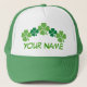 Lucky four leaf clover St Patricks Day design on green and white trucker hat that you can personalized with a name!