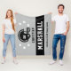 Personalized football themed fleece blanket for players when they're not scoring touchdowns on the field, and for their parents to support their kids and stay warm at chilly games! Makes a unique team gift. Design features a football helmet customized with the player's uniform number, custom text for the player's first and last name, and modern text for the team name. Stylish and modern design features sporty varsity jersey lettering and simple horizontal stripes with star accents. The colour scheme of grey, black, and white can be modified to coordinate with your team colours.