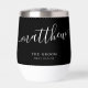Personalized Groom Elegant Black White Script Calligraphy Name Thermal Wine Tumbler. Easy to customize elegant script typography. Perfect wedding party or bridal party accessory gift idea!